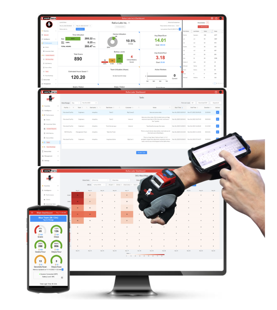 Rufus WorkHero is your central dashboard for warehouse operations managers to supercharge workforce productivity. Rufus wearable computers and barcode scanners feed your WorkHero dashboard with real-time scanning metrics, scan & non-scan labor tasks, and other workforce data to improve your modern frontline workforce continuously. Analyze labor metrics & manage resources, send team messages, motivate team, and assign direct & indirect tasks all from your dashboard.